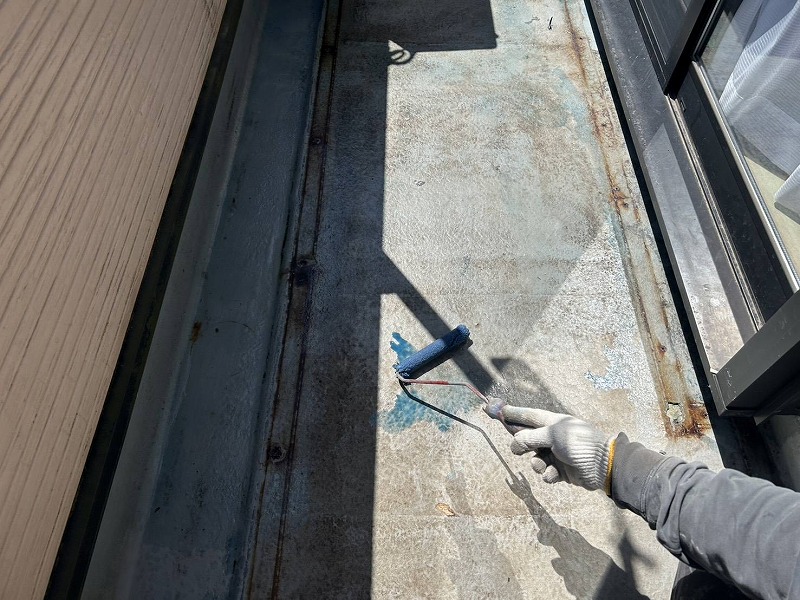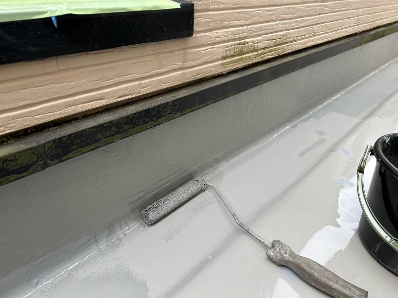 ウレタン塗膜防水 通気緩衝工法にて施工しました。この工法は、下地に含まれる水分による膨れを防ぎ、コンクリートのひび割れなどの影響を受けにくくするため、長寿命で耐久性の高い防水層が形成できます。